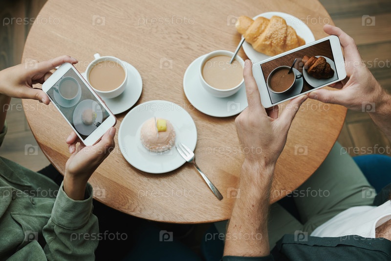 Вид сверху неузнаваемого мужчины, фотографирующего черный кофе и кроассан на столе в кафе, концепция стиля жизни блогеров