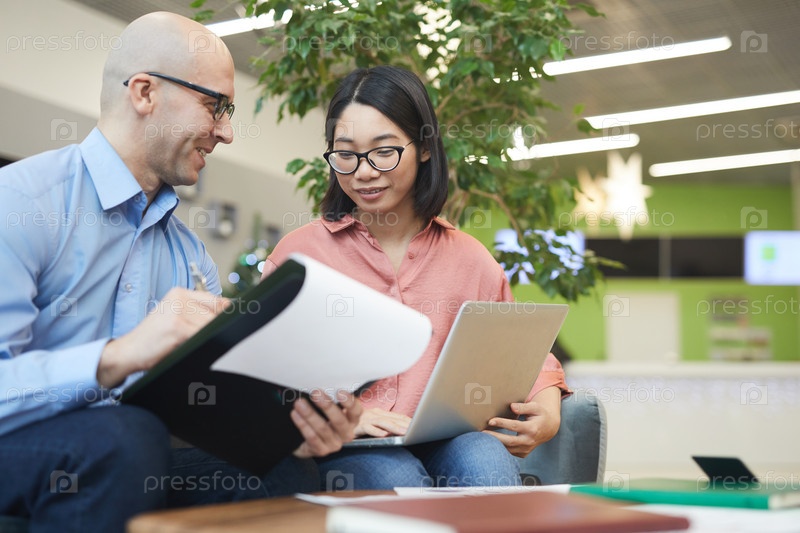 Азиатская женщина разговаривает с менеджером по стажировкам