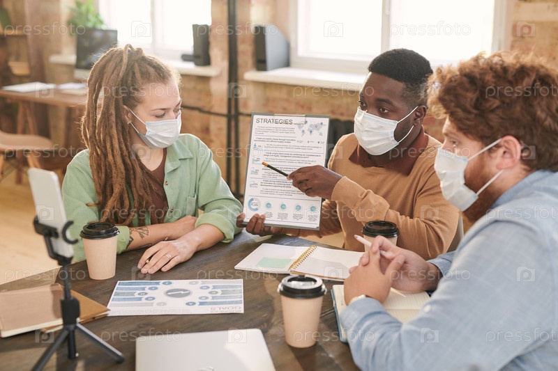 Уверенный в себе молодой афроамериканский мужчина с маской, указывающий на отчет о стратегиях и представляющий его боссу через телекоммуникационное приложение на смартфоне