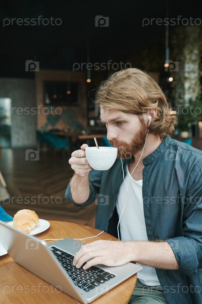 Серьезный красивый молодой человек с бородой сидит за столом и звонит коллеге по телефону, ожидая его в кафе