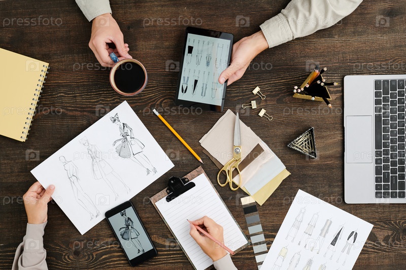 Обзор рук молодых модных дизайнеров, обсуждающих новую коллекцию