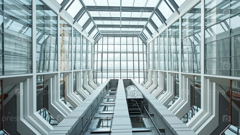 Часть интерьера современного бизнес-центра с лифтом, движущимся вверх