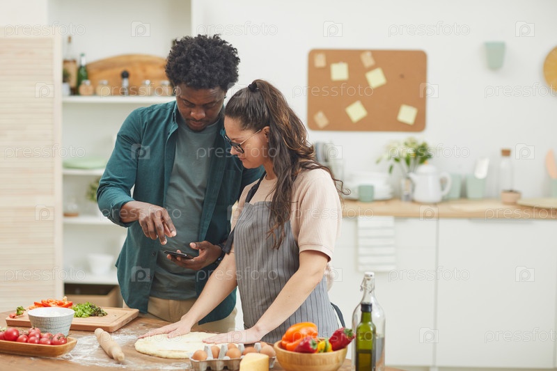 Пара готовит еду с помощью мобильного приложения