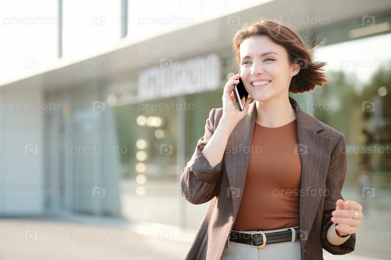 Современная молодая веселая бизнесвумен с клиентом-консультантом по смартфону
