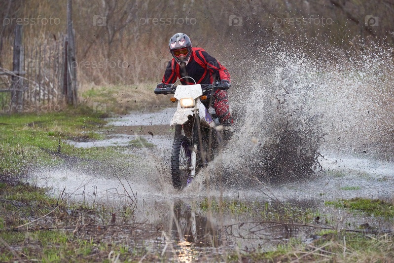 Гонщик мотоцикла-кросса гоняется в затопленном лесу