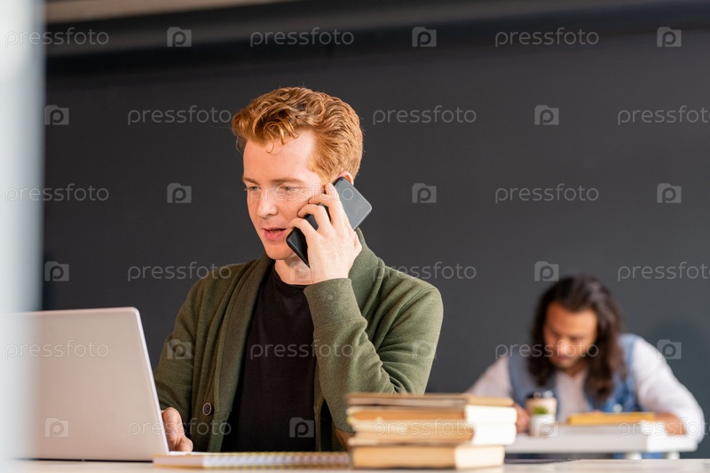 Молодой агент или офисный менеджер со смартфоном в ухе, смотрящий на дисплей ноутбука