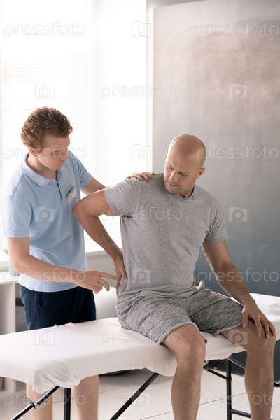 лысый зрелый мужчина с болью в спине, сидящий на медицинском диване в клиниках