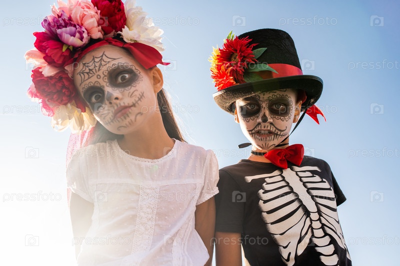 Тёмный и пугающий Хэллоуин мальчик и девочка с покрашенными лицами смотрят на тебя