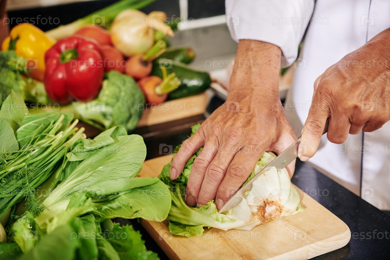 Человек, отрезающий корень салата