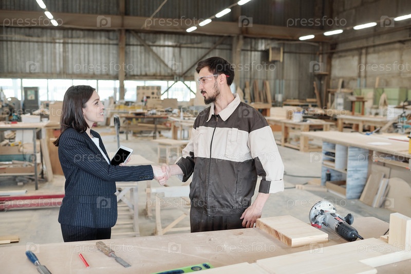Красивая молодая женщина-менеджер или бизнес-партнер, пожавшая руку работнику