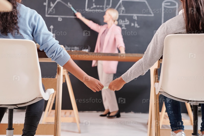 Руки двух девушек, сидящих у столов и передающих друг другу колыбельные или глупые записки