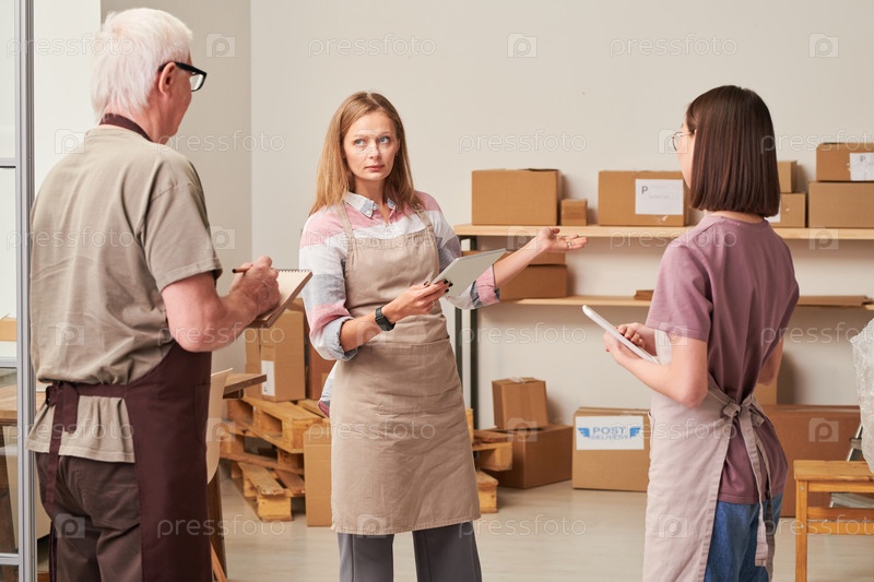 Привлекательная молодая женщина-менеджер в фартуке использует планшет, объясняя систему хранения новому пожилому сотруднику