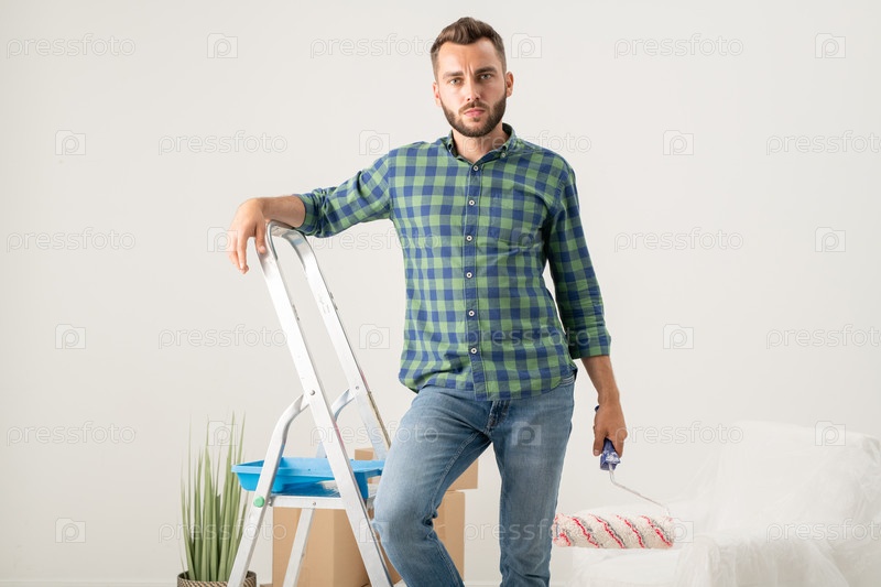 Мужчина стоит на лестнице в новой квартире
