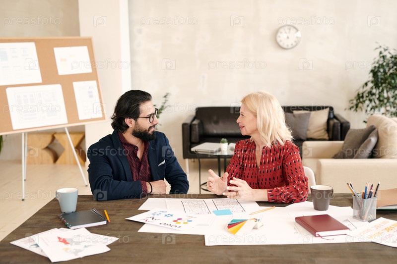 Молодой бородатый дизайнер и его счастливая зрелая блондинка-коллега разговаривают
