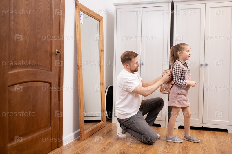 Молодой отец кладет маленький рюкзак на спину своей милой дочки