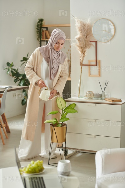 Стильная мусульманка в повседневной одежде с хиджабом поливает домашние растения в гостиной, вертикальный полный снимок
