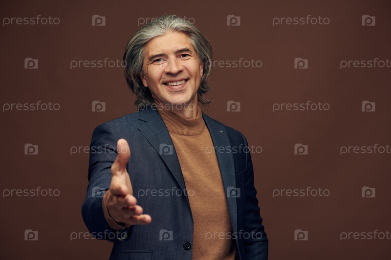 Портрет веселого удовлетворенного зрелого бизнесмена в куртке, протягивающего руку для рукопожатия, коричневый фон