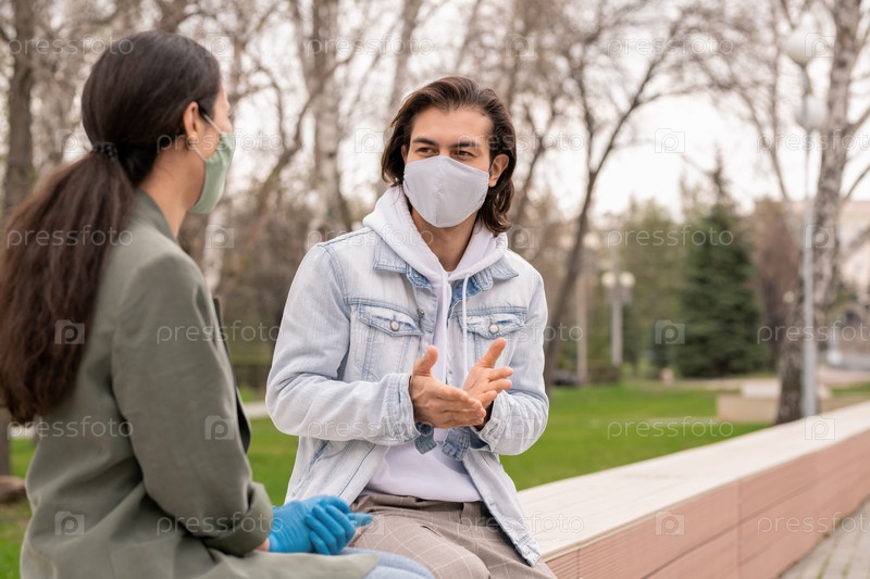 Молодой человек и его девушка в защитных масках обсуждают что-то