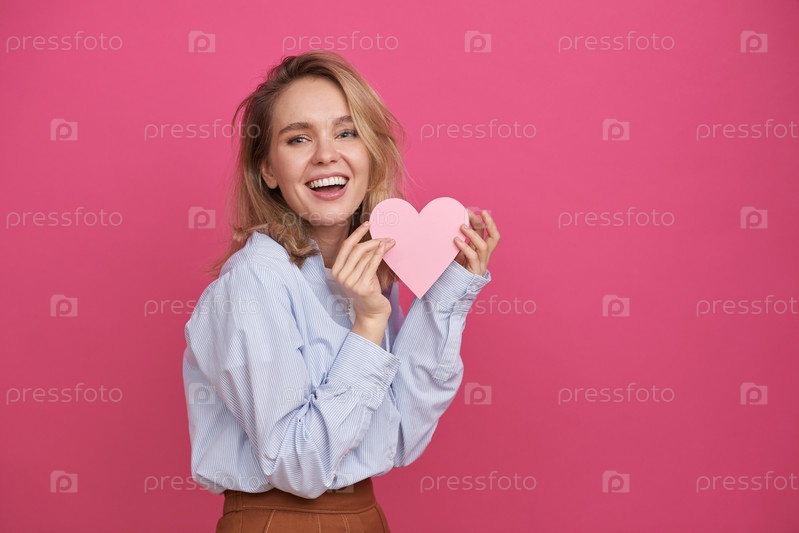 Средний портрет радостной молодой женщины с светлыми волосами, стоящей на розовом фоне стены и держащей бумажное сердце, улыбающейся в камеру