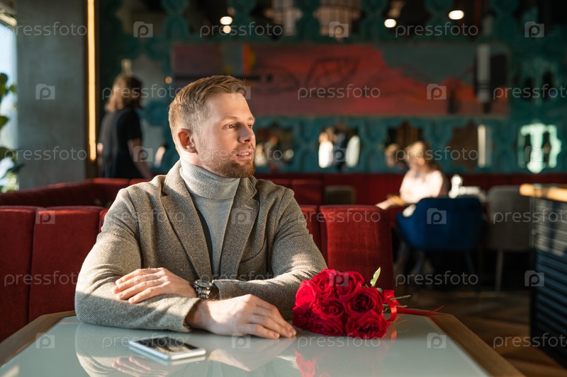 Молодой человек с букетом или красными розами и смартфоном сидит в ресторане
