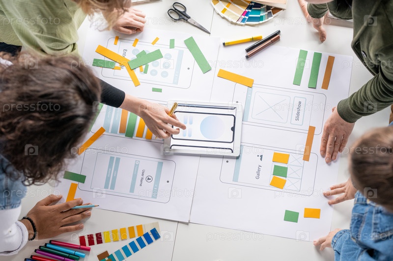 Верхний вид молодых творческих профессиональных разработчиков программного обеспечения, обсуждающих эскизы