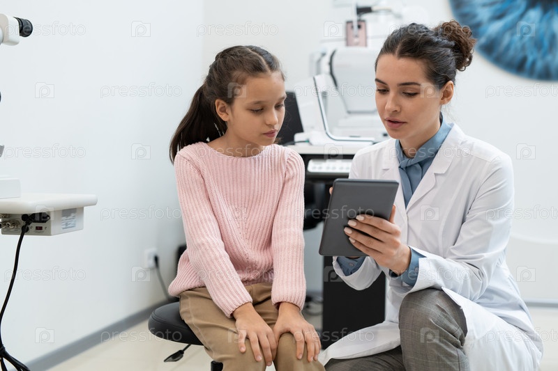 Молодая женщина-офтальмолог показывает школьнице результат проверки зрения