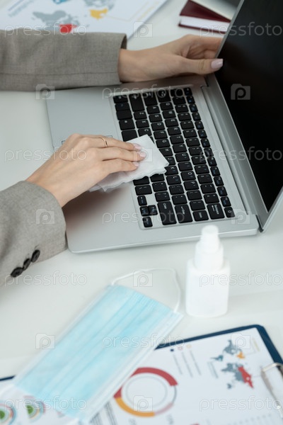 Руки молодой современной деловой женщины в формальной одежде, стирающей клавиатуру ноутбука
