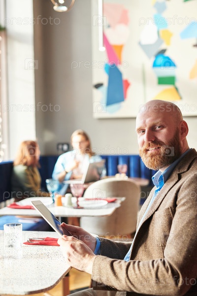 лысый бизнесмен, использующий планшет в кафе
