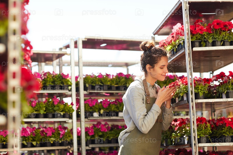 Улыбающаяся молодая женщина, нюхающая цветы на плантации