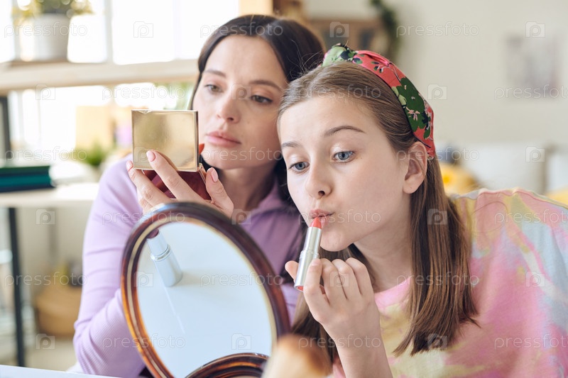 Милая девочка-подросток с длинными светлыми волосами наносит помаду и смотрит в зеркало