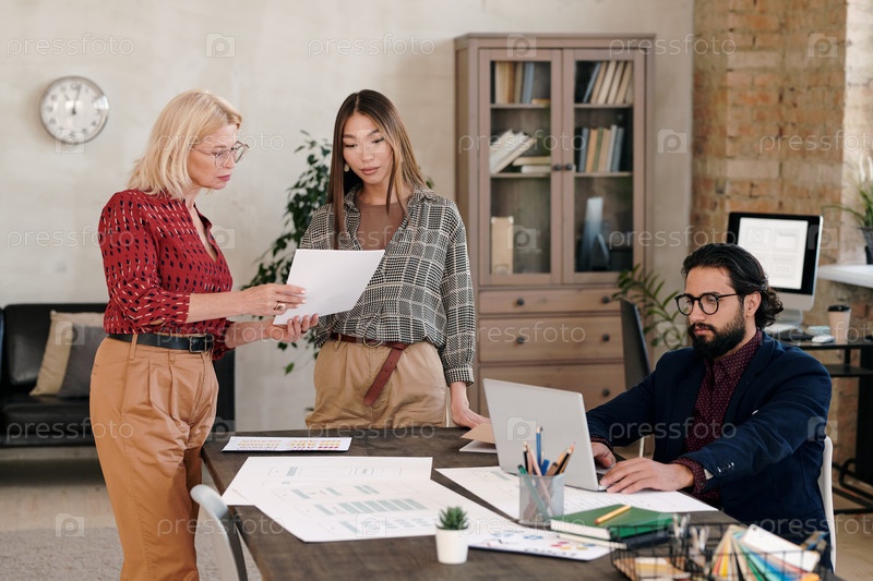 Молодые и зрелые женщины, стоящие за столом и обсуждающие эскиз на бумаге