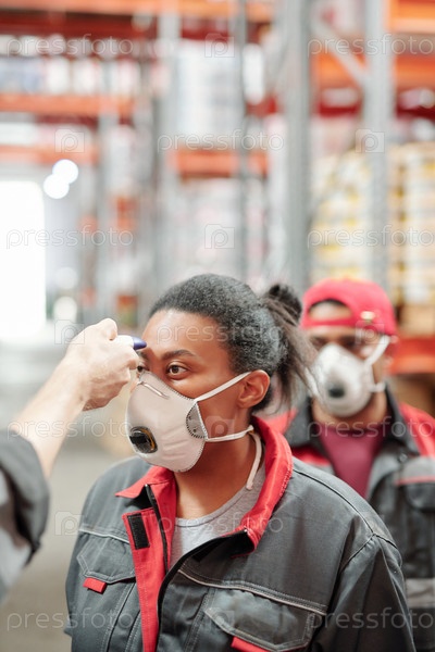 Работница склада в респираторе и рабочей одежде получает измерение температуры