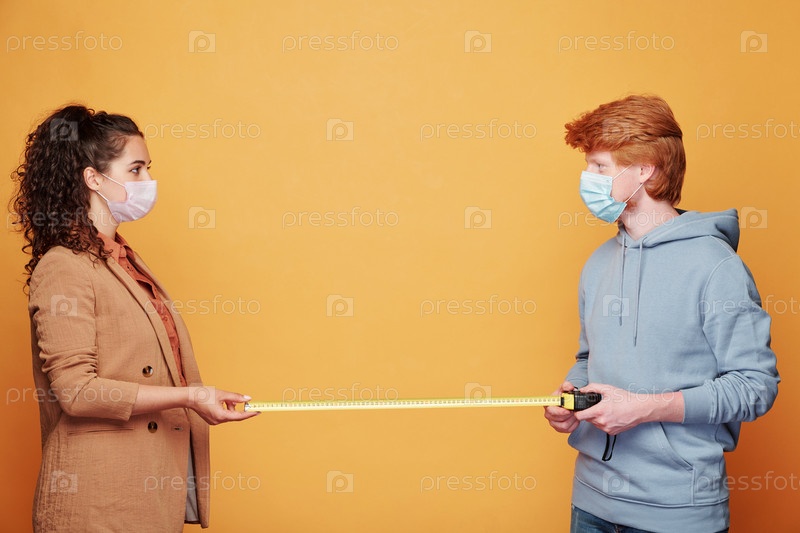 Двое молодых друзей в защитных масках стоят друг перед другом