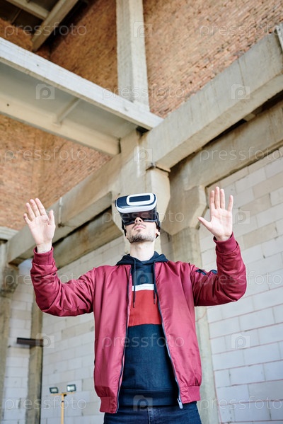 Молодой человек в повседневной одежде и VR гарнитуре стоит на большом виртуальном дисплее