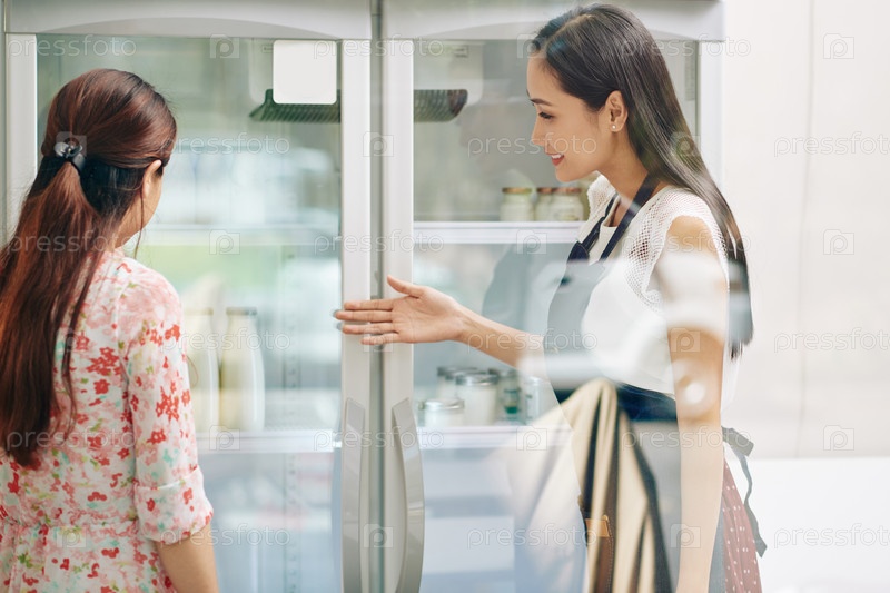 Помощник магазина, показывающий продукты