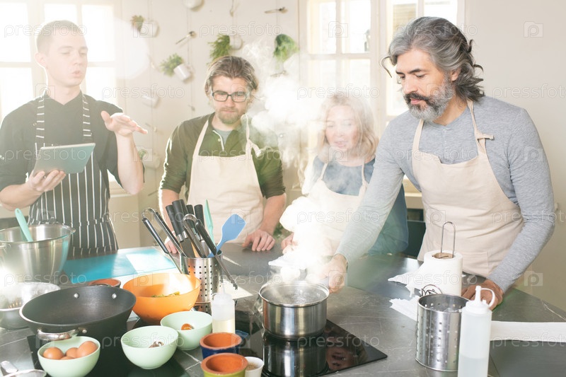 Группа молодых и зрелых людей, слушающих мужского тренера по приготовлению пищи с планшетом
