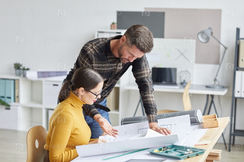 Два архитектора работают на чертежном столе