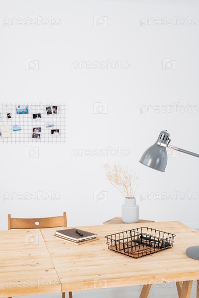 Деревянный стол с лампой, растение в горшке, блокнот с ручкой и другие вещи