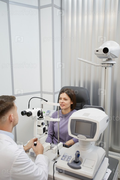 Оптометрист использует оборудование во время обследования пациента