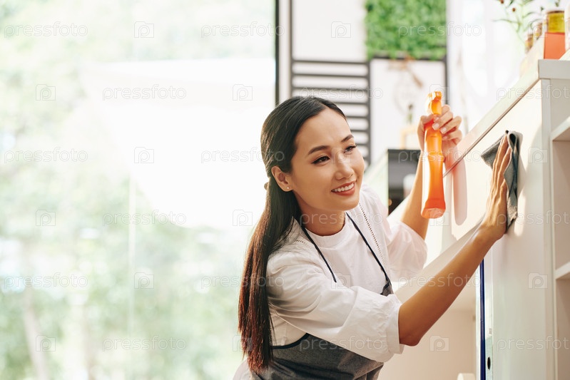 Женщина, стирающая прилавок в кафе