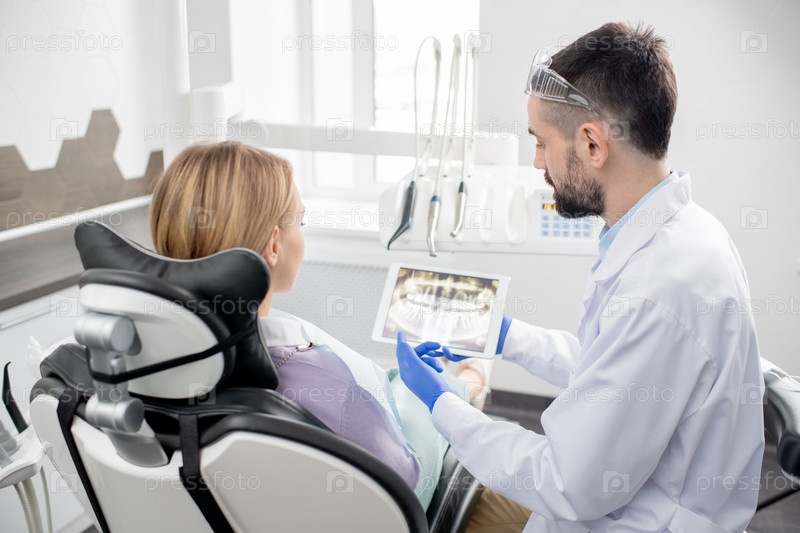 Молодой стоматолог-мужчина объясняет своей пациентке все проблемы с ее зубами