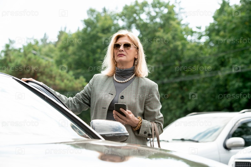 Элегантная зрелая бизнес-агентка использует смартфон, стоя у машины