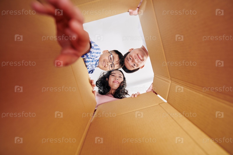 Семья смотрит внутрь картонной коробки