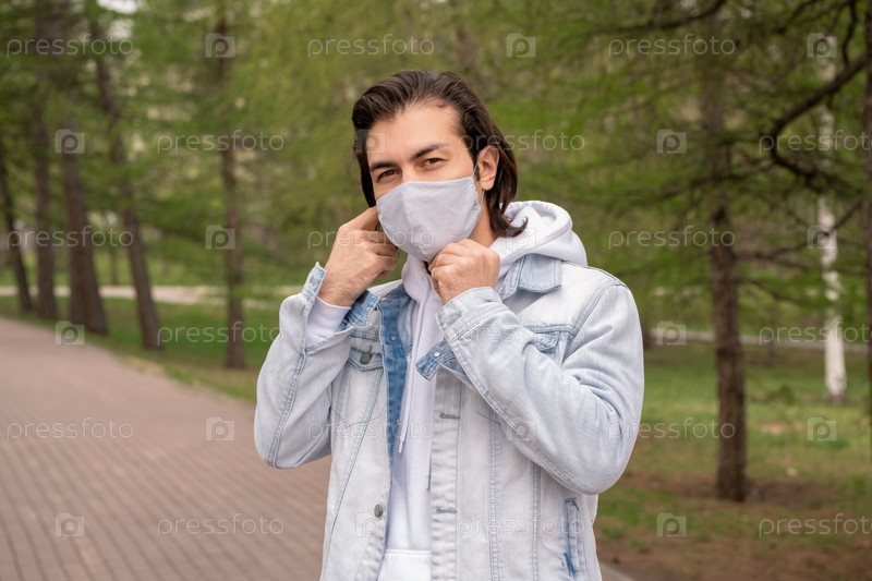 Молодой человек надевает защитную маску, стоя на дороге в общественном парке