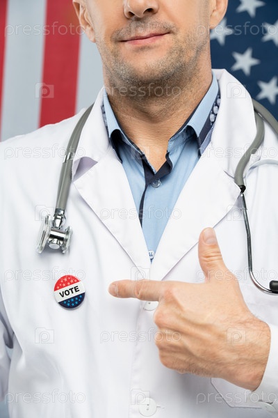 Рука современного зрелого американского клинициста в белом халате, указывающего на значок