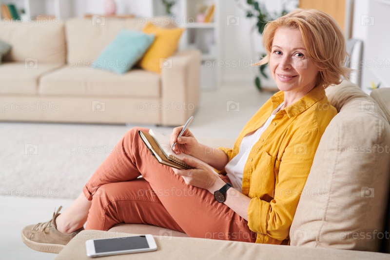 Довольно зрелая деловая женщина в повседневной одежде, сидящая на диване в гостиной
