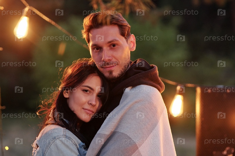 Молодой красавчик, обернувшийся в ковры и обнимающий свою красивую девушку