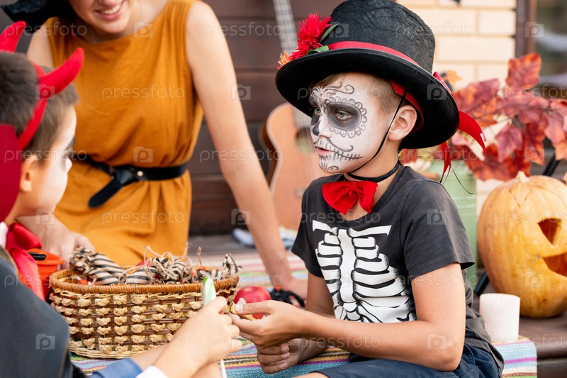 Милый мальчик в умном костюме Хэллоуина смотрит на своего друга, получая лакомства