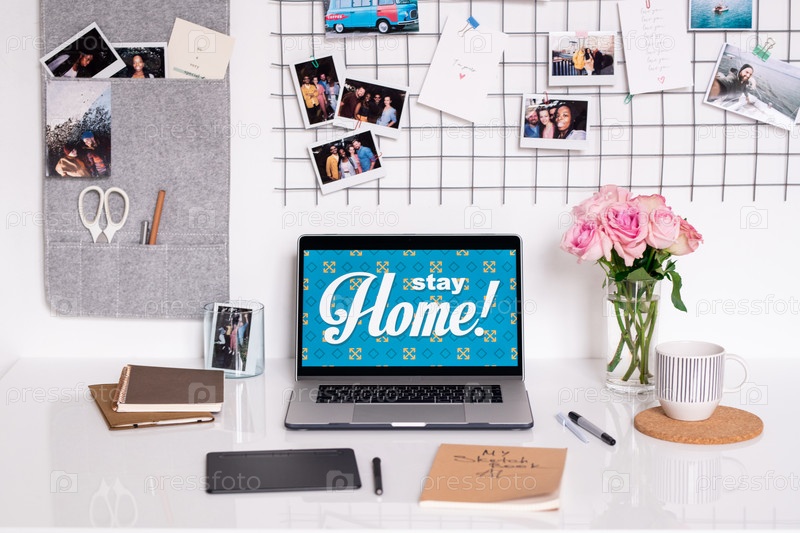Стена с фотографиями и стол с принадлежностями современного дизайнера