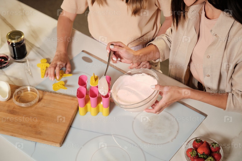 Руки молодой женщины кладут смесь из домашних ингредиентов мороженого